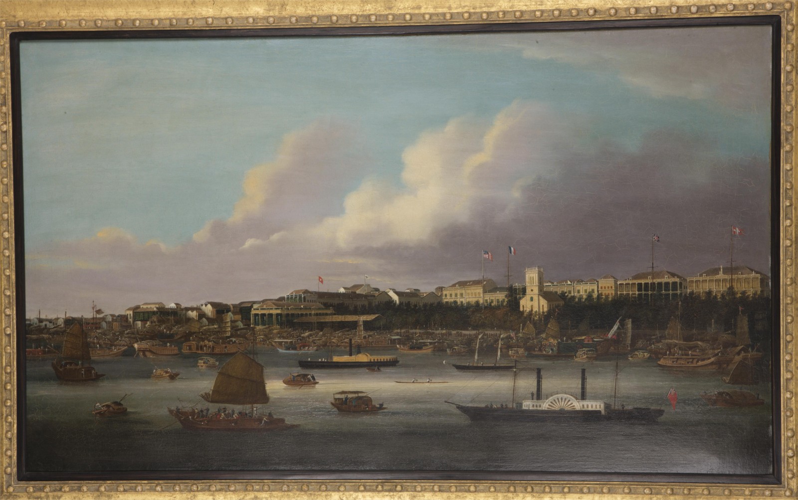 这件《煜呱风格绘十三行》创作于1850年代晚期,是一幅记录广州十三行风貌的重要历史绘画作品。画作以棉麻纤维为材质,画心尺寸为65×111厘米,现藏于广东省博物馆。