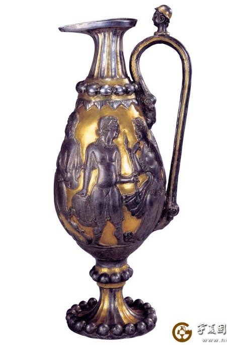 - 壶身腹部锤一周突起的3组6人男女图像,描绘的是希腊神话故事。