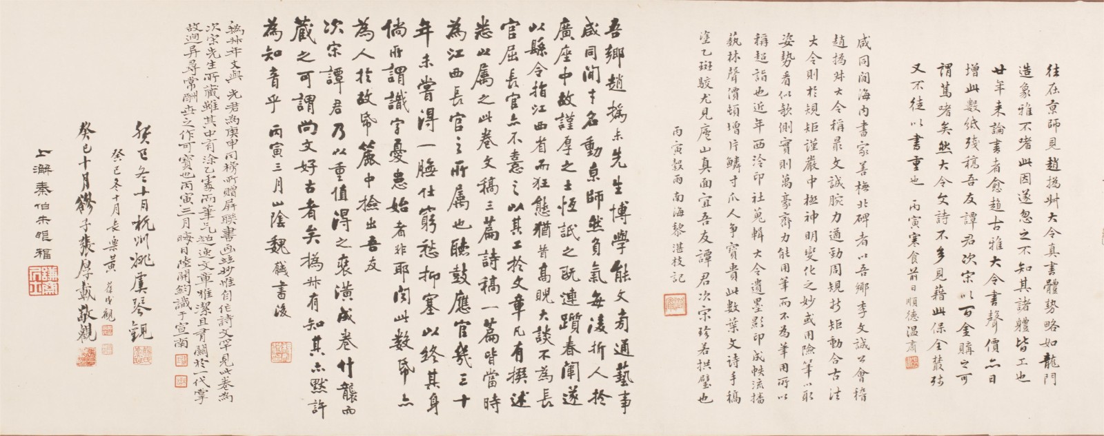 清赵之谦行书文稿卷是赵之谦手稿类书法作品的重要代表,展现了他作为晚清全能艺术大师在文稿书写方面的独特造诣。赵之谦的行书文稿具有笔墨腴润、机致洒落的皎然风神,大得翰逸神飞之致。他在《与梦醒书》中曾自评:'于书仅能作正书,篆则多率,隶则多懈,草本不擅长,行书亦未学过,仅能稿书而已。然平生因学篆而能隶,学隶始能为正书。'这种自谦之词恰恰反衬出他行书文稿的独特价值。赵之谦的行书文稿用笔起迄,临纸翩翻,结字疏密掩映,似欹反正,机趣逸出,随处可掬。在分行布白上,错错落落,信手拈来,一任天机,达到了出神入化的境界。他的文稿书法往往是在日常书写状态下完成的,没有刻意求工的匠气,反而透露出真挚的情感和自然的书写状态。这种'稿书'风格融合了碑学的刚健骨力与帖学的流畅韵味,既有金石气息,又有书写的情趣。赵之谦的行书文稿卷不仅具有极高的书法艺术价值,还承载着丰富的历史文化信息,是研究赵之谦艺术思想和创作过程的重要实物资料。这些手稿作品体现了文人书法的精髓,将实用性与艺术性完美结合,是中国传统书法艺术宝库中的珍贵遗产。