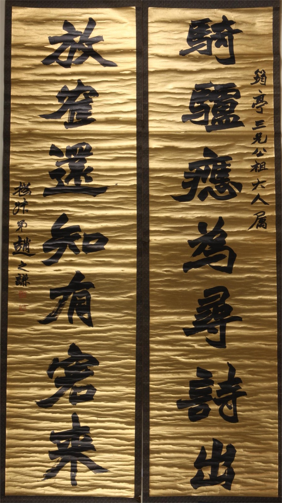 清赵之谦行楷七言联尺寸为纵210厘米×横53.5厘米,采用纸质材质。此作是赵之谦对联艺术的精品,展现了他在行楷书法上的独特造诣。赵之谦的行楷书法以独特的"碑帖融合"理念为核心,形成了兼具北碑雄浑与帖学流美的艺术特征。他创造性地将魏碑的方峻骨力与颜体的圆润笔意结合,形成"魏底颜面"的独特风格。其点画方俊,起笔多逆锋切入,收笔常以转锋形成刀刻般的斜切面,既保留了北碑的刚健,又融入了颜体的浑厚。赵之谦强调中锋行笔,以篆籀笔法为核心,追求线条的立体感与金石气。他通过"捻管调锋"技法调整笔锋方向,使笔画兼具力度与弹性。这种技法既保留了北碑的方硬感,又避免了机械模仿刀刻的呆板。赵之谦行楷结构以扁方为主,重心偏上,形成"上紧下松"的视觉特征。他吸收黄庭坚与《瘗鹤铭》的结字理念,强调字内空间的疏密对比与动态平衡。此七言联不仅展现了赵之谦在书法艺术上的高超技艺,更体现了他对传统艺术的创新精神,具有极高的艺术价值和收藏价值。