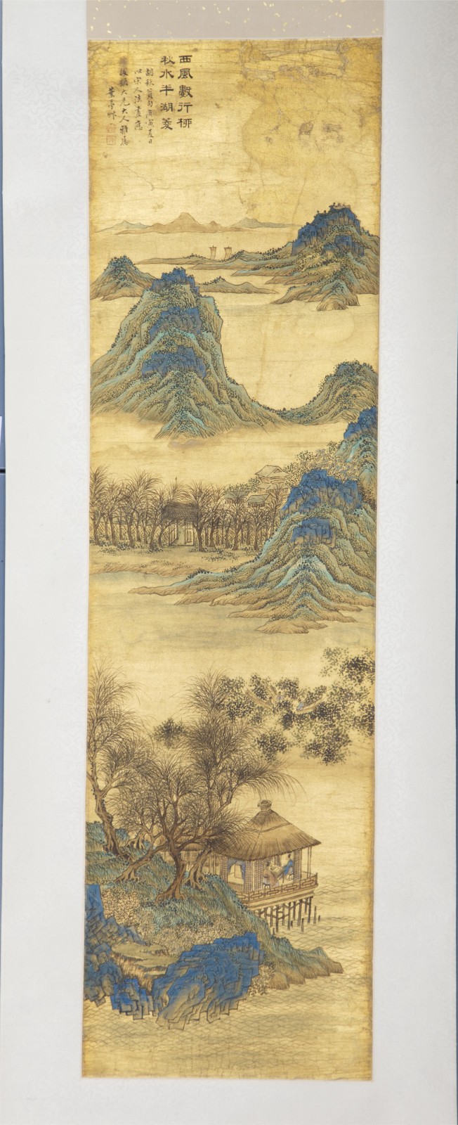 这件清代叶梦草创作的金碧荷塘读书图轴,展现了中国传统金碧山水画的独特魅力。金碧山水是在大青绿山水的基础上,用勾金、染金、涂金等方法提注画面,使作品呈现金碧辉煌的艺术效果。画面以荷塘为背景,描绘了文人雅士于荷塘之畔读书的场景,体现了清代文人追求高雅生活情趣和潜心治学的精神风貌。作品绘制技法精湛,先勾皴轮廓,以赭色分染明暗,再平涂石绿、石青等矿物颜料,最后以金粉勾勒点缀,使画面色彩绚丽而不失典雅。荷叶、荷花等元素刻画细致,人物形象生动传神,整体构图和谐,意境悠远。此类作品不仅具有极高的艺术欣赏价值,也是研究清代文人生活、绘画技法和审美情趣的重要实物资料。