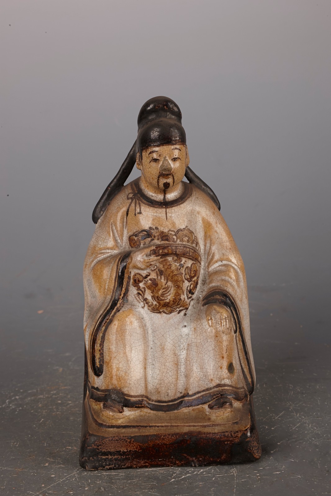这件明代磁州系人物坐像是一件珍贵的瓷器文物,高19厘米,属于明代磁州窑系的作品。磁州窑是中国北方著名的民间瓷窑,以白地黑花装饰著称,其产品具有浓厚的民间生活气息。这件人物坐像造型生动,体现了明代民间瓷塑的艺术特色。磁州窑人物瓷塑通常采用模印成型后施釉烧制,釉色多为白釉或酱釉,装饰手法简洁明快。这件坐像可能是表现民间信仰中的神祇或历史人物,反映了明代民间工艺美术的审美趣味和制作水平。磁州窑系瓷器在明代继续发展,产品种类丰富,既有日常生活用器,也有陈设观赏品,这件人物坐像属于后者,具有较高的艺术价值和历史研究价值。