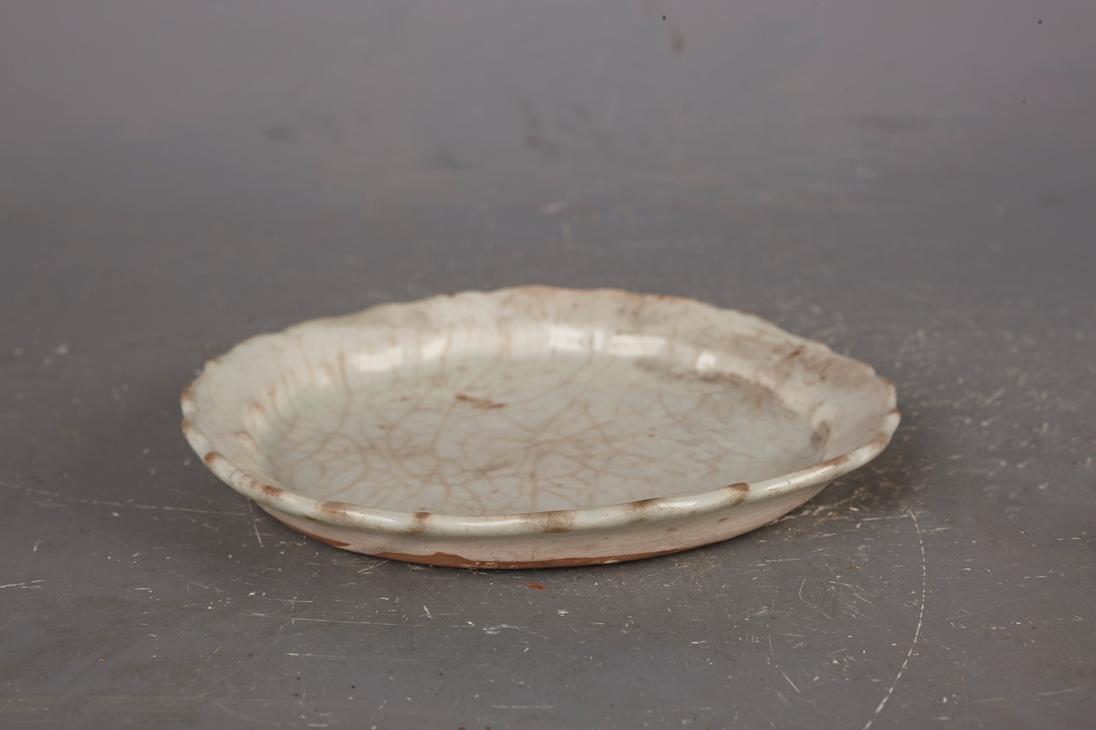 这件元影青釉瓣口盘是元代影青瓷器的精品,高1.7厘米,口径15厘米,造型精巧别致。元代影青瓷器在继承宋代工艺的基础上有所发展,釉色更加丰富,装饰更加多样。这件瓣口盘的口沿呈花瓣状,设计独特,体现了元代瓷器在造型上的创新。元代瓷器生产规模扩大,技术更加成熟,影青瓷器在这一时期继续发展。瓣口设计不仅美观,也便于使用,反映了元代瓷器在实用性与艺术性结合上的成就。元代影青瓷器釉面光滑,色泽青白相间,具有独特的艺术魅力。这件元影青釉瓣口盘虽然尺寸不大,但工艺精湛,是研究元代瓷器发展的重要实物资料,展现了元代瓷器艺术的独特风格和技术水平。