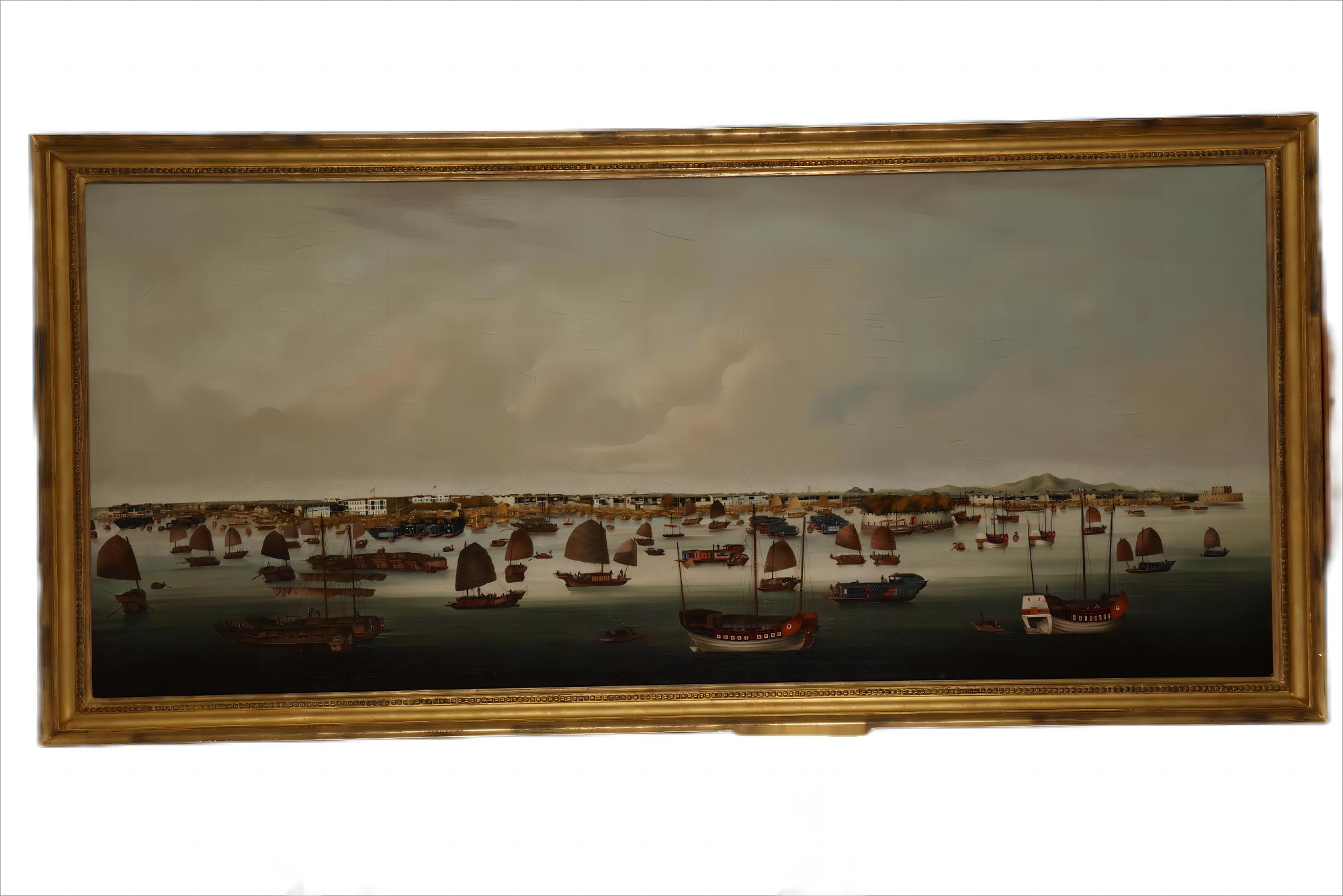 这件《疑煜呱广州港全景图》创作于约1845年,是一幅气势恢宏的纸本绘画长卷作品。画作尺寸为88×200厘米,现藏于广东省博物馆。