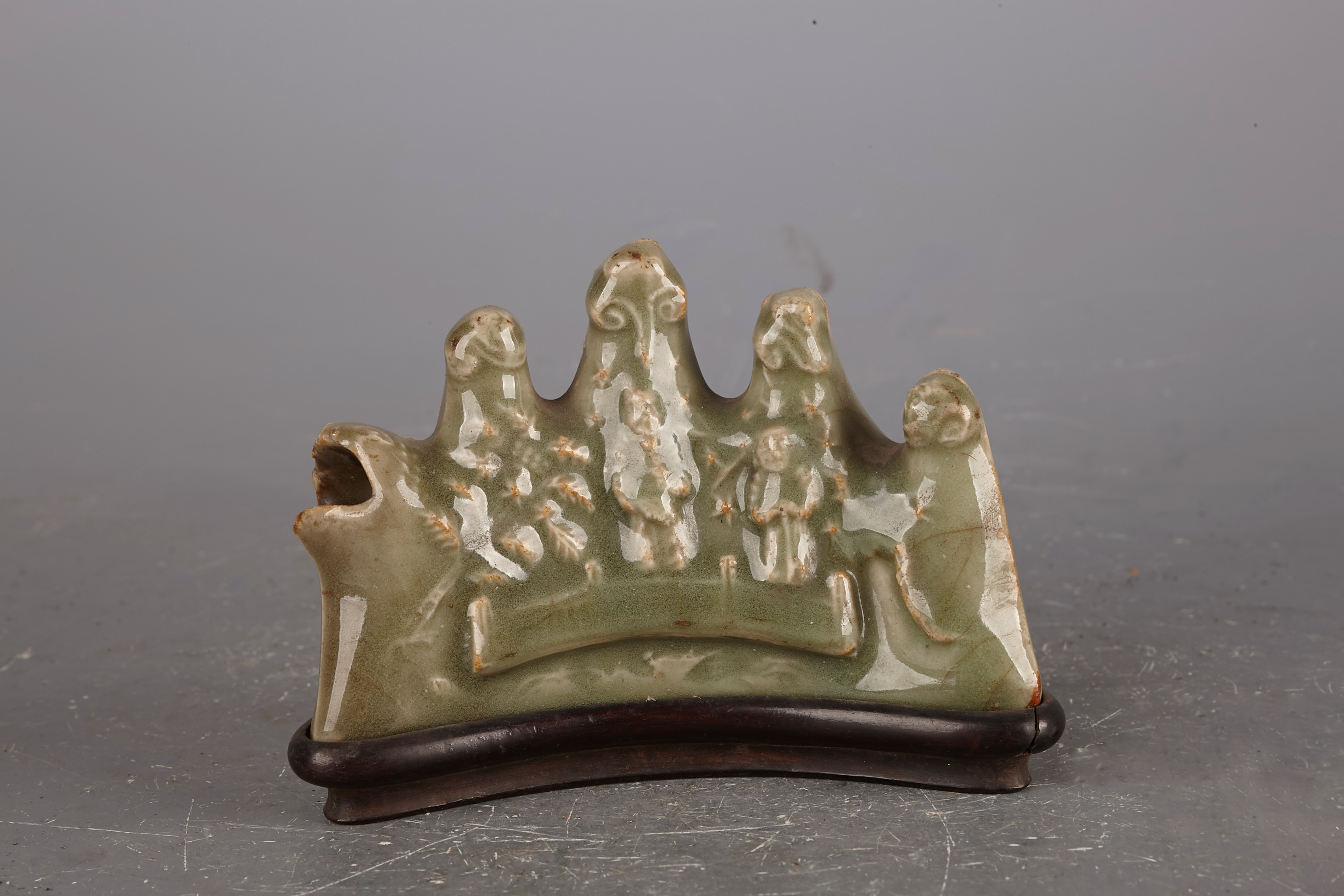 明嘉靖龙泉青釉浮雕人物笔架是一件明代嘉靖时期的龙泉窑瓷器,现藏于广东省博物馆。此笔架高10厘米,口径12.7厘米,属于文房用具中的笔架类器物。龙泉窑是中国古代著名的青瓷窑场,创烧于北宋,盛于南宋至明代,以青釉瓷器闻名于世。嘉靖时期是明代龙泉窑发展的一个重要阶段,此时的龙泉青釉色泽深沉,釉质莹润。此笔架采用浮雕工艺,在器表雕刻人物纹饰,体现了明代龙泉窑的高超技艺。笔架作为文房用具,主要用于搁置毛笔,是文人书斋中的重要陈设品。龙泉窑生产的文房用具品种丰富,笔架即是其中一种,其制作工艺及纹饰都具有代表性。此件笔架不仅具有实用功能,更是一件精美的艺术品,反映了明代文人士大夫的生活情趣和审美追求。