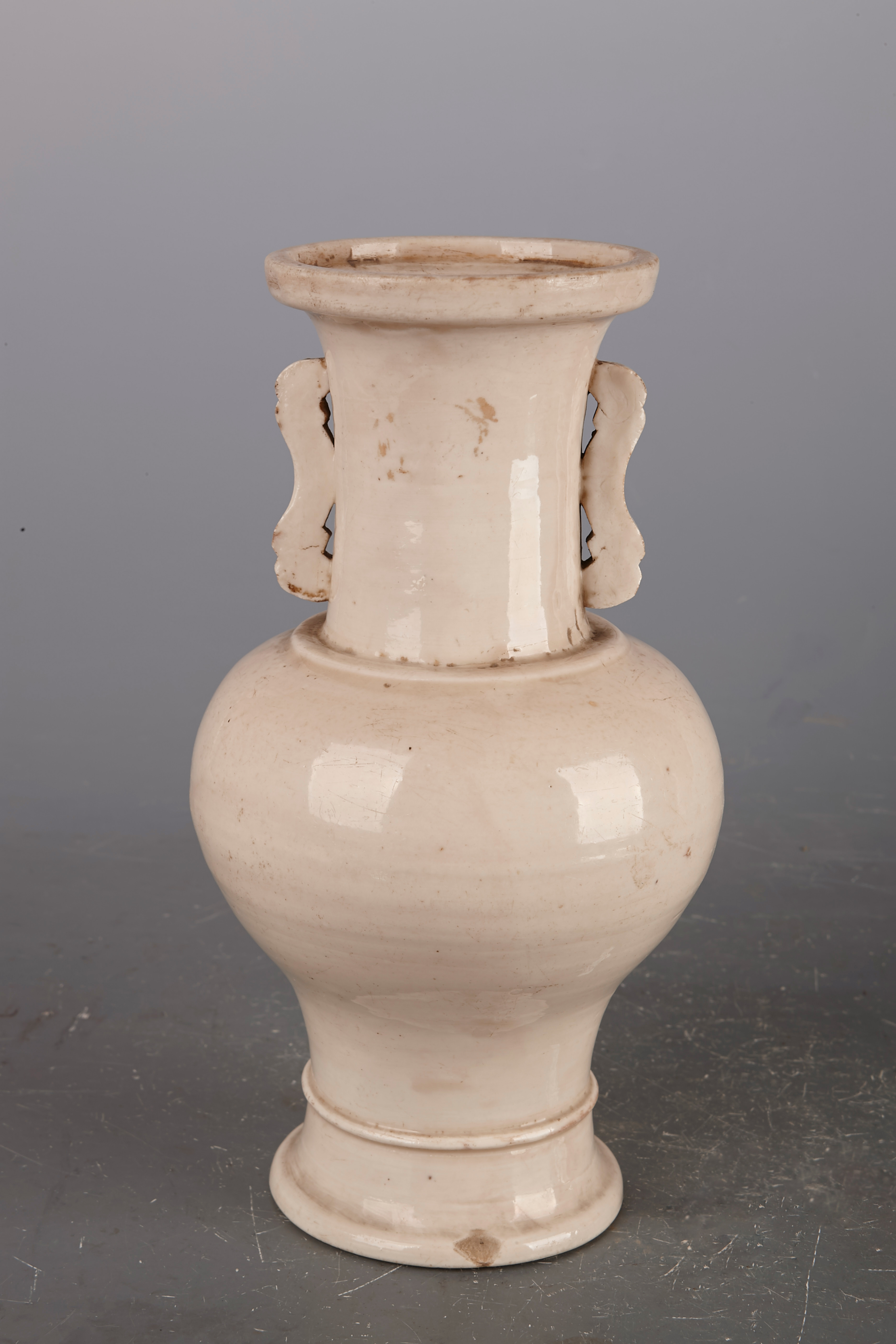 明万历德化窑白釉双耳盘口瓶是一件明代万历时期的德化窑白瓷器,现藏于广东省博物馆。此瓶高22.7厘米,口径8.8厘米,底径8.7厘米,属于典型的德化窑白瓷作品。德化窑位于福建省德化县,是中国古代著名民窑,以白瓷制作闻名于世,始烧于宋代,盛于明清时期。万历时期是德化窑发展的一个重要阶段,此时的德化白瓷工艺成熟,釉色莹润,胎质细腻。此瓶采用盘口造型,颈部两侧对称置双耳,器型端庄典雅。盘口瓶是明代流行的瓶式之一,其口沿外撇如盘状,故名盘口瓶。双耳装饰不仅增强了器物的稳定性,也起到了美化作用。德化白瓷以其独特的"象牙白"釉色著称,釉质肥厚滋润,如脂似玉,被誉为"中国白"。此件双耳盘口瓶体现了明代德化窑白瓷的高超技艺和艺术成就,是研究明代瓷器艺术的重要实物资料。