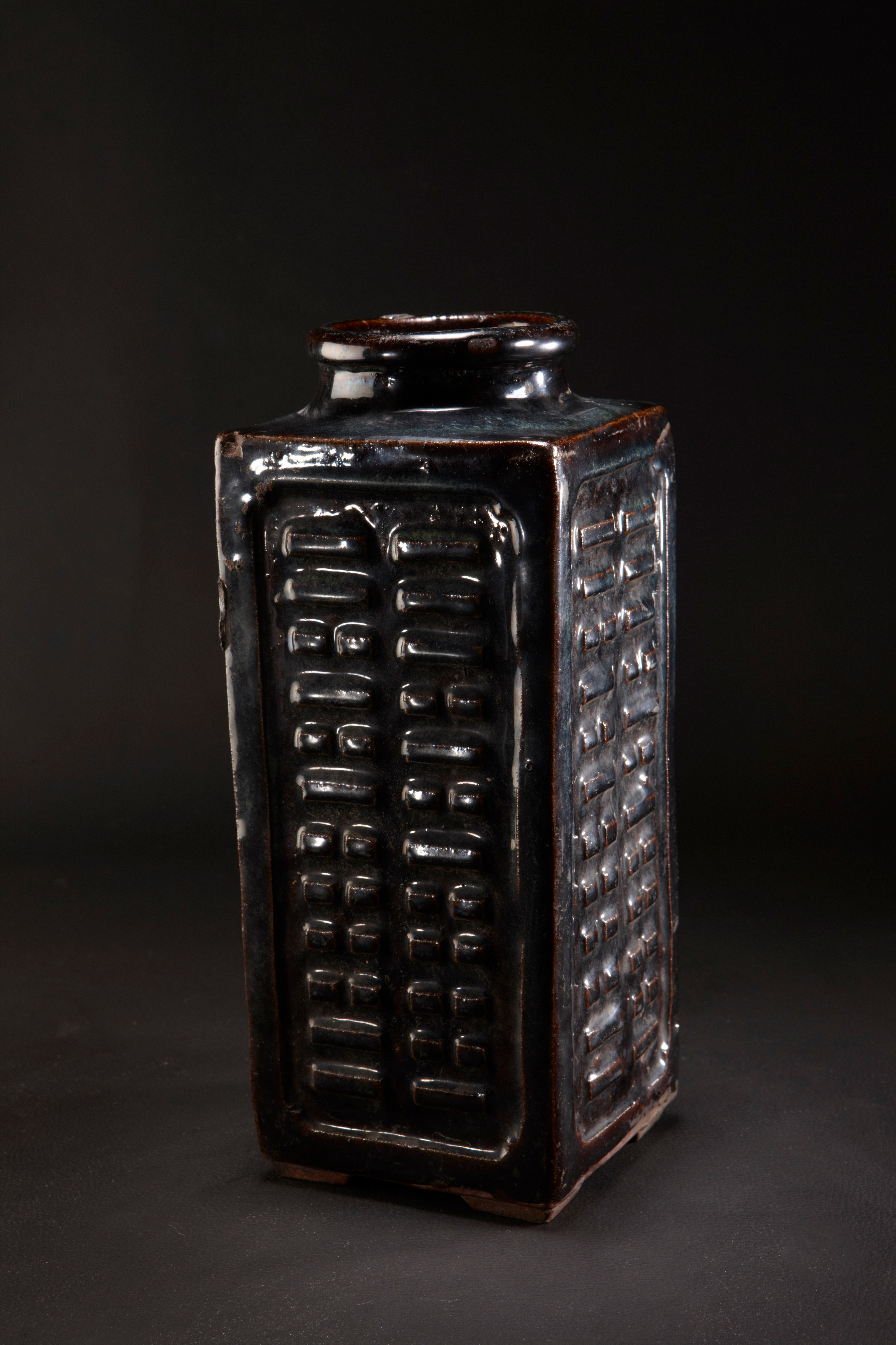 明宜兴八卦琮式瓶是一件明代宜兴窑陶器,高27.2厘米,口径8.5厘米,底径10.5厘米,现藏于广东省博物馆。这件琮式瓶仿照新石器时代玉琮造型,小口,方腹,圈足,外壁四面各凸起八卦纹饰,体现了中国传统天圆地方的宇宙观。琮式瓶始见于宋代,南宋官窑、龙泉窑均有烧制,明代宜兴窑继承并发扬了这一器型。八卦纹饰源自《易经》,象征天地万物的变化规律,是道教文化的重要体现。宜兴窑以生产紫砂陶器闻名,而八卦琮式瓶则展现了该窑口在仿古礼器制作方面的工艺水平。这件器物造型古朴典雅,纹饰寓意深远,既是实用器皿,又是承载传统文化内涵的艺术品,反映了明代文人雅士对古器物的崇尚和仿制热情。
