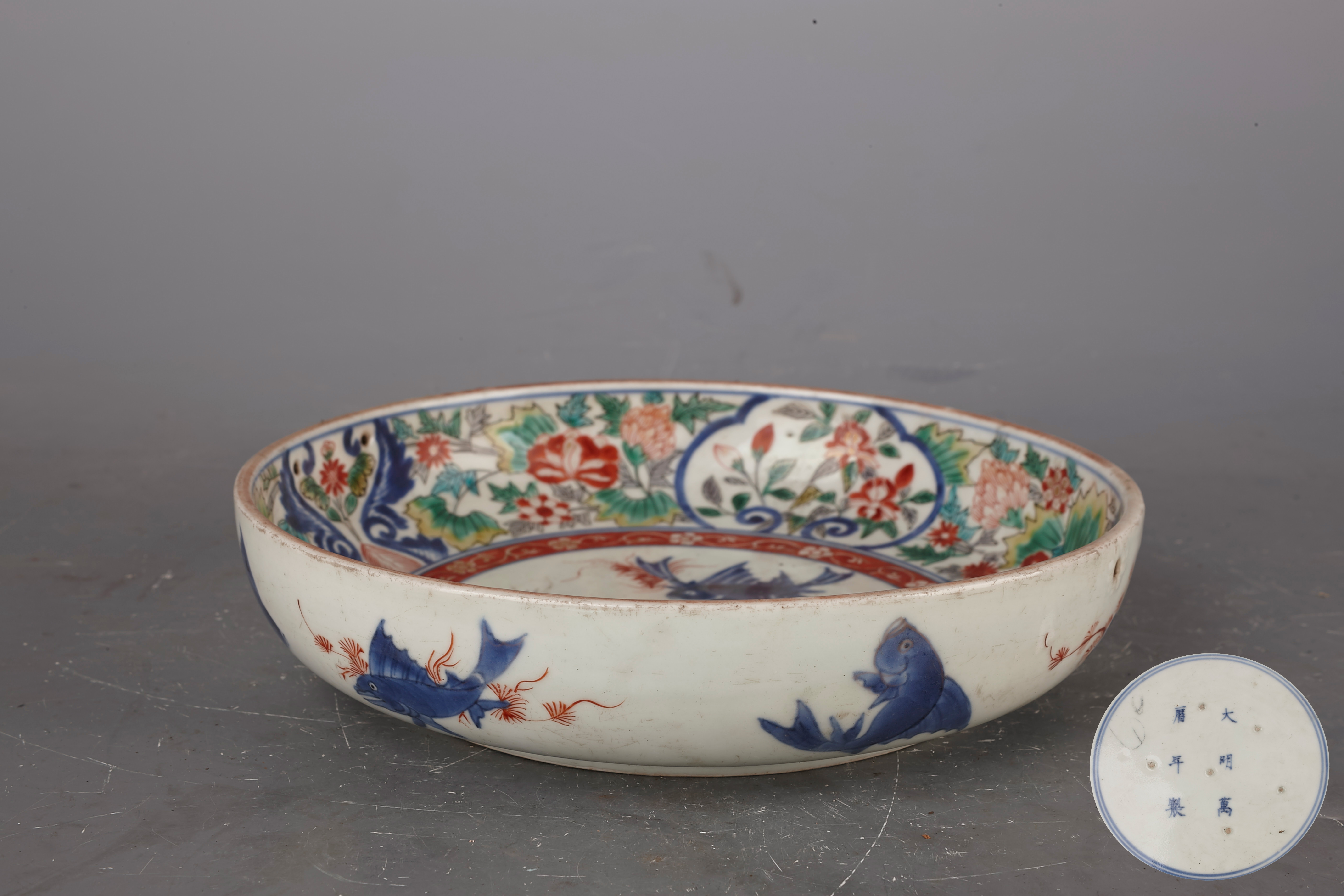 康熙仿万历描金五彩花卉鱼藻盘是清代康熙时期仿制明代万历风格的瓷器精品,尺寸为高5.2厘米、口径22.4厘米、底径15.5厘米,现藏于广东省博物馆。这件盘采用描金五彩工艺,在釉上施以红、绿、黄、蓝等多种彩料,并以金彩勾勒轮廓,色彩鲜艳夺目。盘面装饰花卉鱼藻纹饰,鱼藻纹是中国传统瓷器的重要装饰题材,鱼象征'年年有余'的吉祥寓意,水草花卉则展现自然生机。康熙时期是五彩瓷器发展的鼎盛阶段,仿古风格盛行,这件仿万历风格的瓷器既体现了对明代工艺的传承,又展现了康熙时期瓷器装饰技术的创新。描金工艺的运用使纹饰更加富丽堂皇,五彩搭配和谐,画工精细,是研究清代仿古瓷器的重要实物资料。