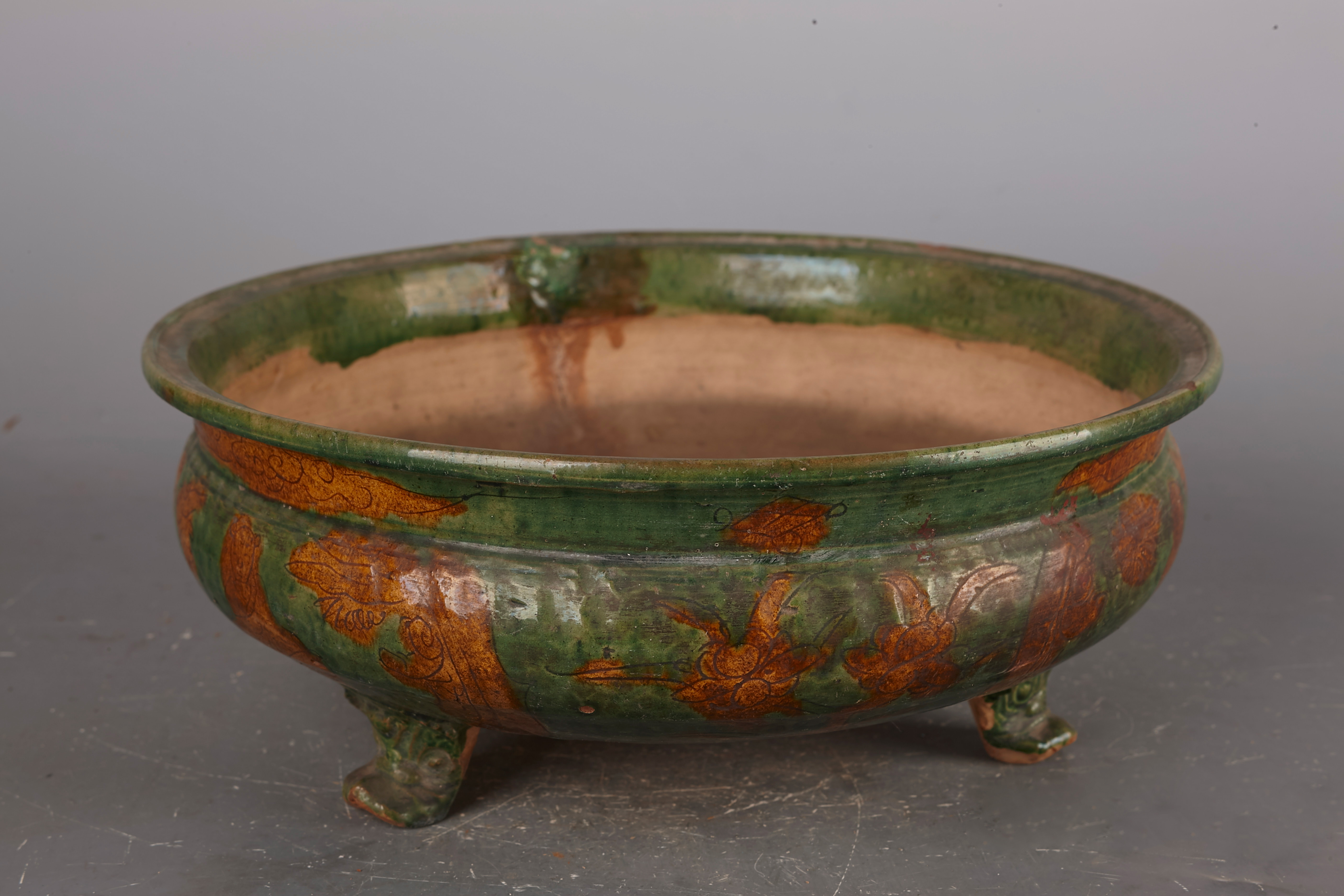 这件明嘉靖绿地黄釉暗花三足炉是明代嘉靖时期瓷器的精品,高11厘米,口径28厘米,现藏于广东省博物馆。炉体采用三足造型,形制端庄稳重,具有典型的明代香炉特征。器物以绿地黄釉为装饰主调,绿色釉面清新雅致,黄色釉彩沉稳厚重,两种釉色相互映衬,形成独特的艺术效果。暗花工艺是这件器物的特色所在,在釉下刻划纹饰,通过釉色的深浅变化呈现图案,工艺精湛细腻。嘉靖时期是明代瓷器发展的重要阶段,这件三足炉不仅体现了当时的制瓷工艺水平,也反映了明代宫廷用器的审美趣味和宗教文化内涵。