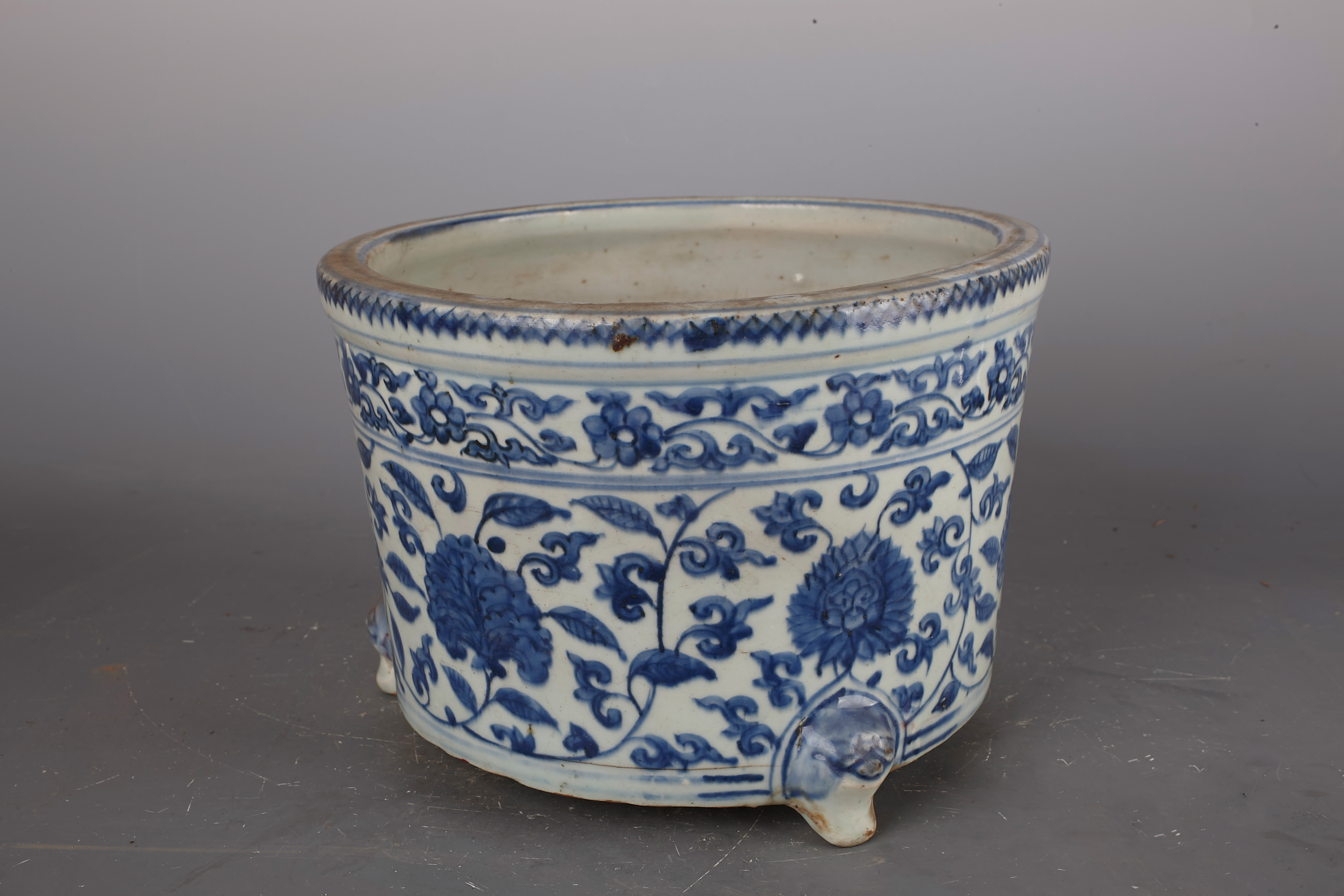 这件明嘉靖青花勾莲三足炉是明代嘉靖时期青花瓷器的精品,高17厘米,口径25.4厘米,现藏于广东省博物馆。炉体采用三足造型,形制端庄稳重,具有典型的明代香炉特征。器物以青花装饰为主,青花发色蓝中带紫,体现了嘉靖时期回青料的特色。纹饰以勾莲为主题,莲花线条流畅优美,勾连缠绕,寓意吉祥美好。嘉靖时期是明代青花瓷器发展的重要阶段,回青料的使用使青花发色更加浓艳,这件三足炉不仅展现了当时的制瓷工艺水平,也反映了明代宫廷用器的审美趣味。勾莲纹饰在中国传统文化中象征纯洁和高雅,体现了明代文人士大夫的审美追求。