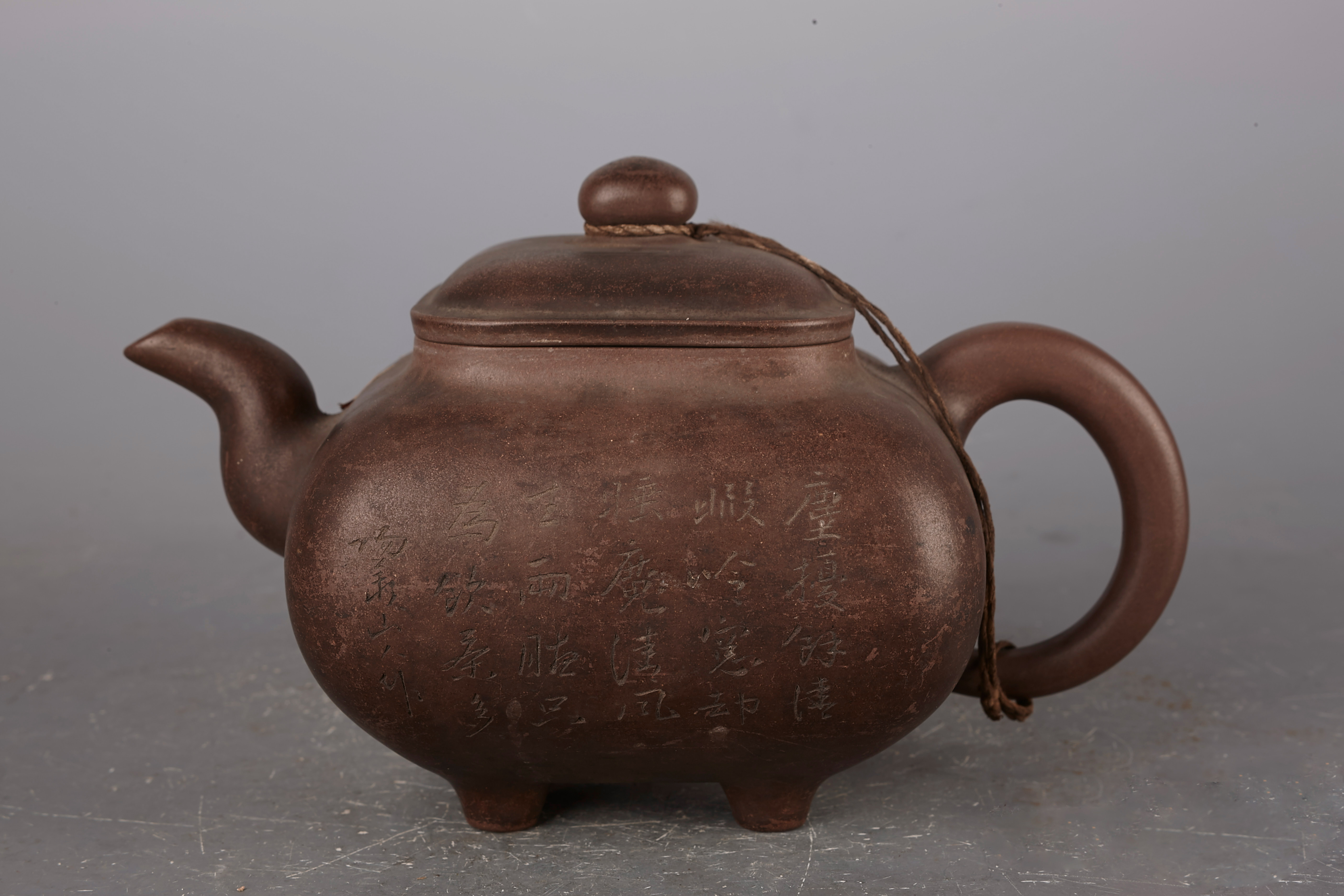 民国宜兴刻竹题字茶壶是一件民国时期的陶器茶具,高11厘米,口径9.2厘米,底径8.2厘米,现藏于广东省博物馆。这件茶壶采用宜兴特有的紫砂陶土制作,体现了民国时期宜兴紫砂壶的工艺特色。宜兴紫砂壶以其独特的材质和精湛的工艺闻名于世,民国时期是紫砂壶发展的重要阶段,这一时期的紫砂壶在继承传统工艺的基础上,融入了更多的文人气息和艺术创新。这件刻竹题字茶壶以竹为主题,壶身刻有竹纹装饰和题字,体现了中国传统文化中竹子的高洁品格和文人雅趣。宜兴紫砂壶的制作工艺源远流长,其原料取自宜兴特有的紫砂泥,这种泥料具有良好的可塑性和透气性,制成的茶壶泡茶不易变味,能够保持茶香。民国时期的紫砂壶在造型设计和装饰技法上更加多样化,刻竹题字是常见的装饰手法,既展现了工艺美术的精致,又体现了文人的审美情趣。这件民国宜兴刻竹题字茶壶不仅是实用的茶具,更是研究民国时期紫砂壶工艺和文人茶文化的重要实物资料。