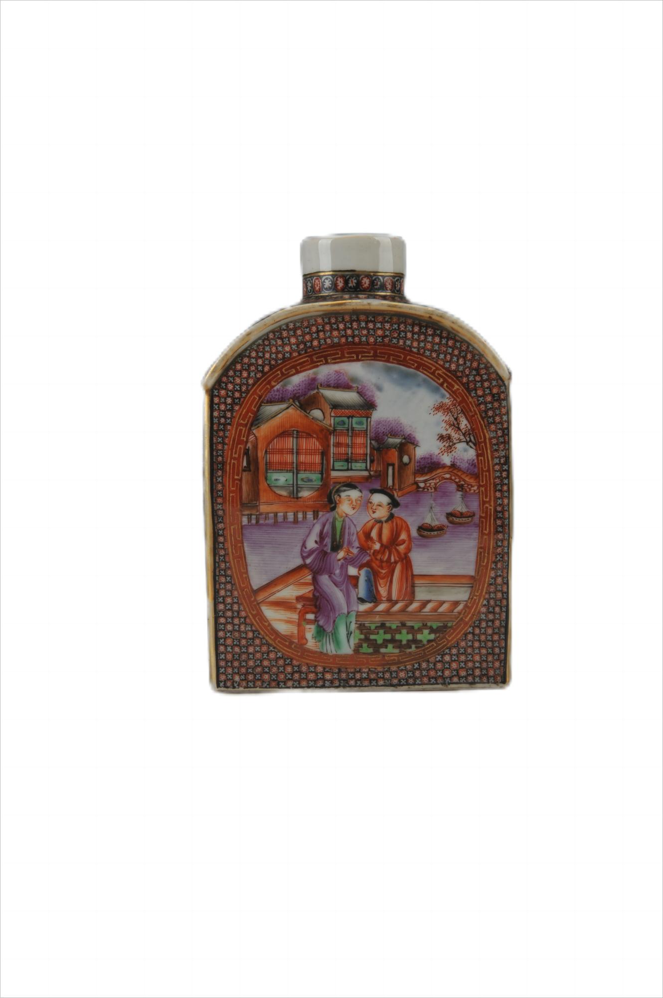 这是一件清乾隆时期的广彩开光人物纹扁瓶,高12厘米,口径2.2厘米,底径7.9厘米,现藏于广东省博物馆。广彩瓷全称"广州织金彩瓷",始于清代康熙晚期,在三彩、五彩、斗彩、粉彩、珐琅彩等多种彩瓷艺术的影响下脱颖而出,盛于乾隆、嘉庆时期,是中国外销瓷器的主要品种之一。此件扁瓶正处于广彩发展的鼎盛阶段,展现了这一时期广彩瓷器"绚彩华丽,辉煌夺目"的艺术特色。瓶身采用开光装饰技法,即在装饰纹样中留出特定区域绘制主题纹饰,这种装饰手法既保留了中国传统装饰风格,又融合了西方审美趣味,极受欧洲市场欢迎。瓶身上的人物纹样精细生动,色彩浓艳明快,金彩装饰富丽堂皇,体现了广州工匠高超的彩绘技艺。作为清代外销瓷的代表作品,这件扁瓶不仅展示了中国制瓷工艺的精湛水平,也见证了18世纪中西贸易的繁荣和文化交流的盛况,是研究清代广东外销瓷和海上丝绸之路贸易历史的重要实物资料。