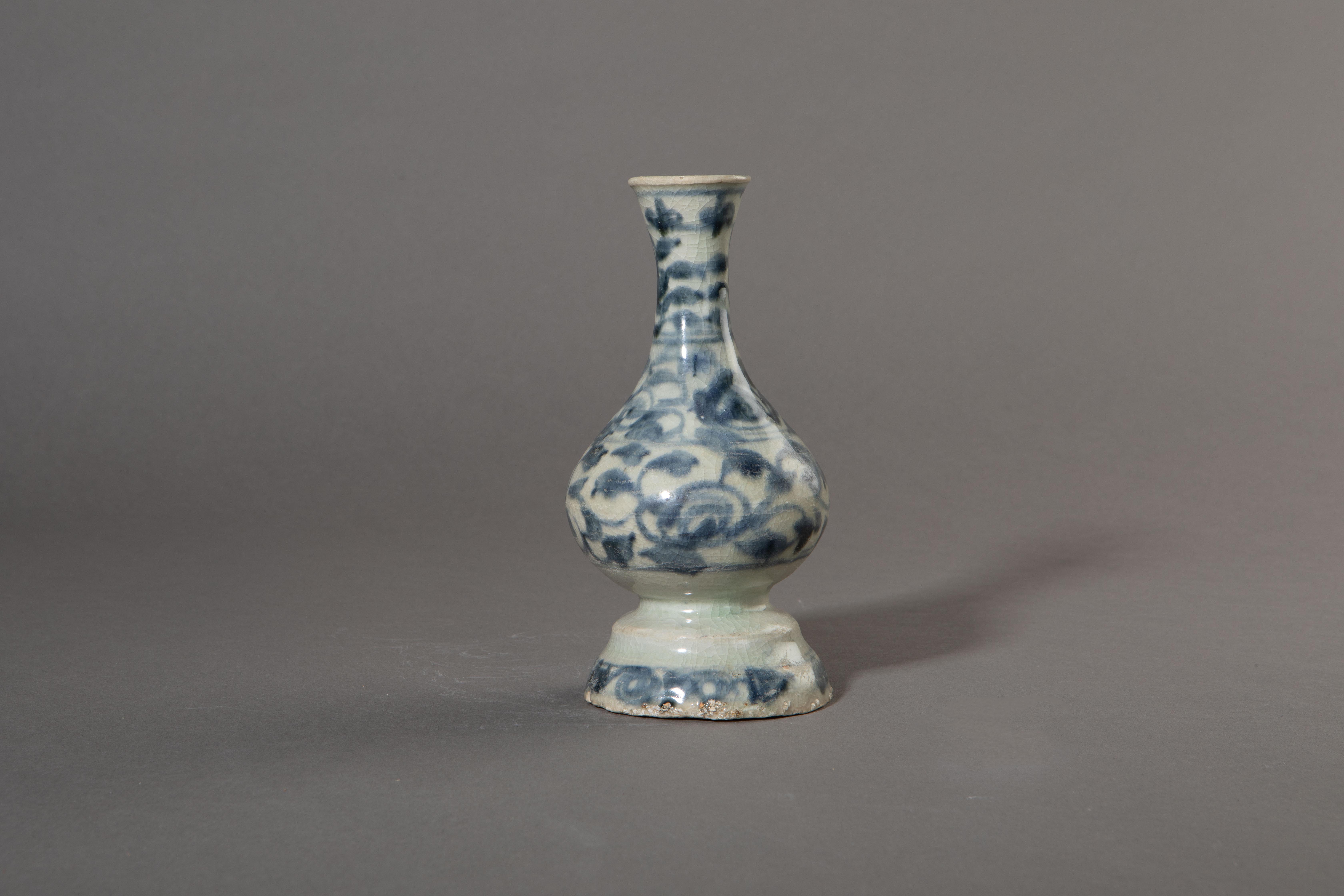 这是一件明代万历年间的漳州窑青花缠枝花卉纹瓷净瓶,口径3.9厘米、底径8.1厘米、高17厘米,由发掘出土。此件文物为瓷器质地,是明代漳州窑外销瓷的精品之作,展现了明代晚期闽南地区制瓷工艺的独特魅力。净瓶又称胆瓶,最初为佛教供器,用于盛装净水或插花供奉。此瓶造型修长优美,胎质坚密白净,釉色青白莹润。器身以青花精心绘制缠枝花卉纹样,线条流畅自然,构图疏密有致,青花发色浓艳明快,具有典型的明代晚期风格特征。明代晚期,漳州窑瓷器凭借其精湛的工艺和独特的艺术风格,成为海上丝绸之路贸易中的重要商品,远销东南亚、欧洲等地。'南澳1号'沉船等考古发现中就出土了大量类似的漳州窑青花瓷器,见证了当时中国瓷器外销的繁荣景象。这件青花缠枝花卉纹瓷净瓶不仅是研究明代漳州窑制瓷工艺的重要实物资料,也是见证明代中国与海外贸易往来和文化交流的历史见证,具有重要的历史价值和艺术价值。