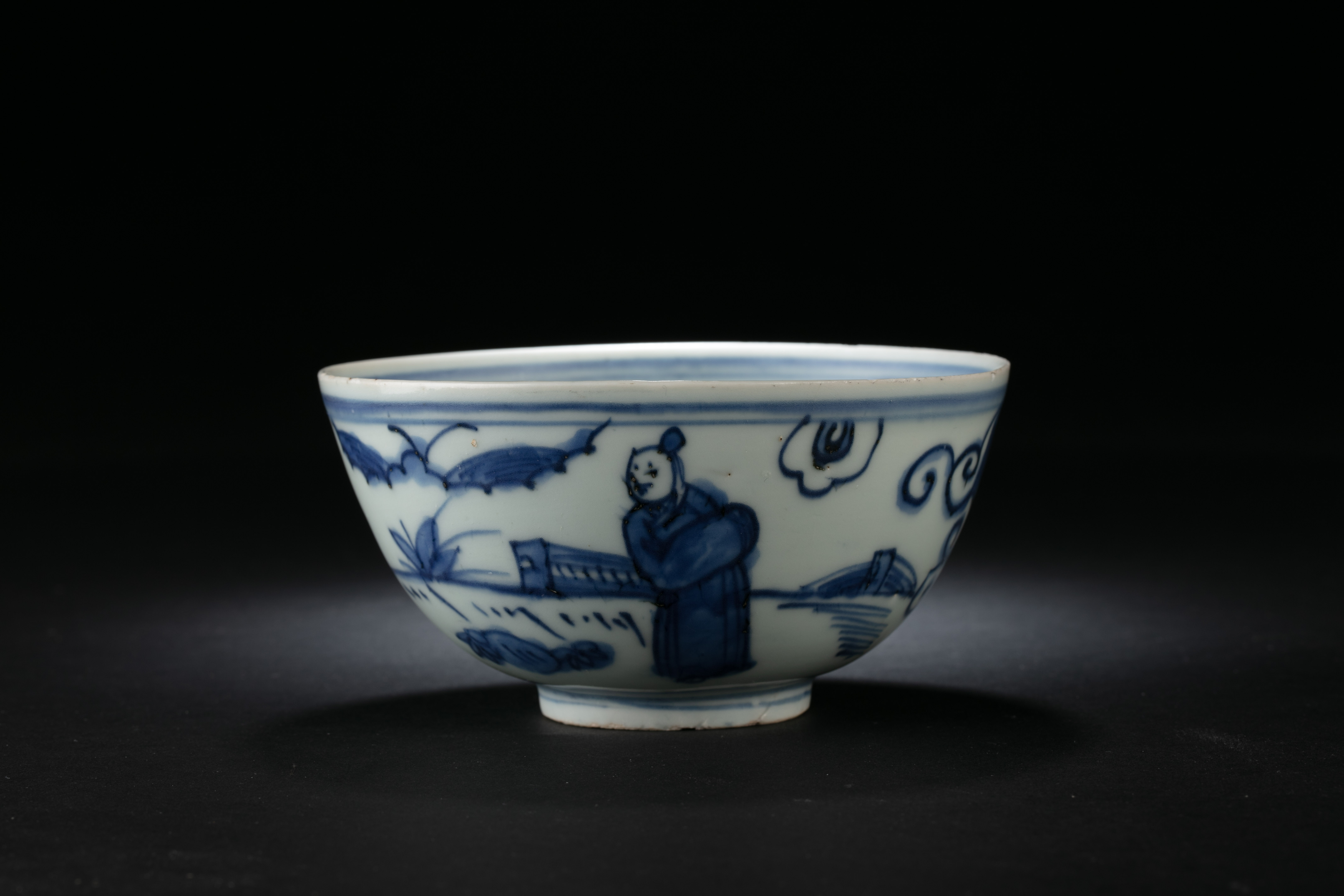 这件明万历青花平步青云图瓷碗高6.2厘米、口径12.3厘米、底径4.6厘米。胎质细腻坚实,釉色青白莹润,青花呈色浓艳,体现了万历时期青花瓷的典型特征。碗型规整,口微撇,腹微弧,圈足矮宽,造型简洁大方而实用。碗身以青花绘制平步青云图,画面中人物身着官服,脚踏祥云,寓意仕途顺利、步步高升。这种吉祥题材在明代中后期极为流行,反映了当时社会对功名富贵的追求和向往。青花绘画线条流畅,笔触细腻,人物形象生动,祥云纹样繁密而有序,展现了万历时期工匠高超的绘画技艺。平步青云图不仅具有强烈的装饰性,更承载着丰富的社会文化内涵,是研究明代社会心态和审美观念的重要实物资料。作为明代青花瓷中的精品,此碗为我们了解万历时期制瓷工艺和装饰艺术提供了宝贵的实物依据。