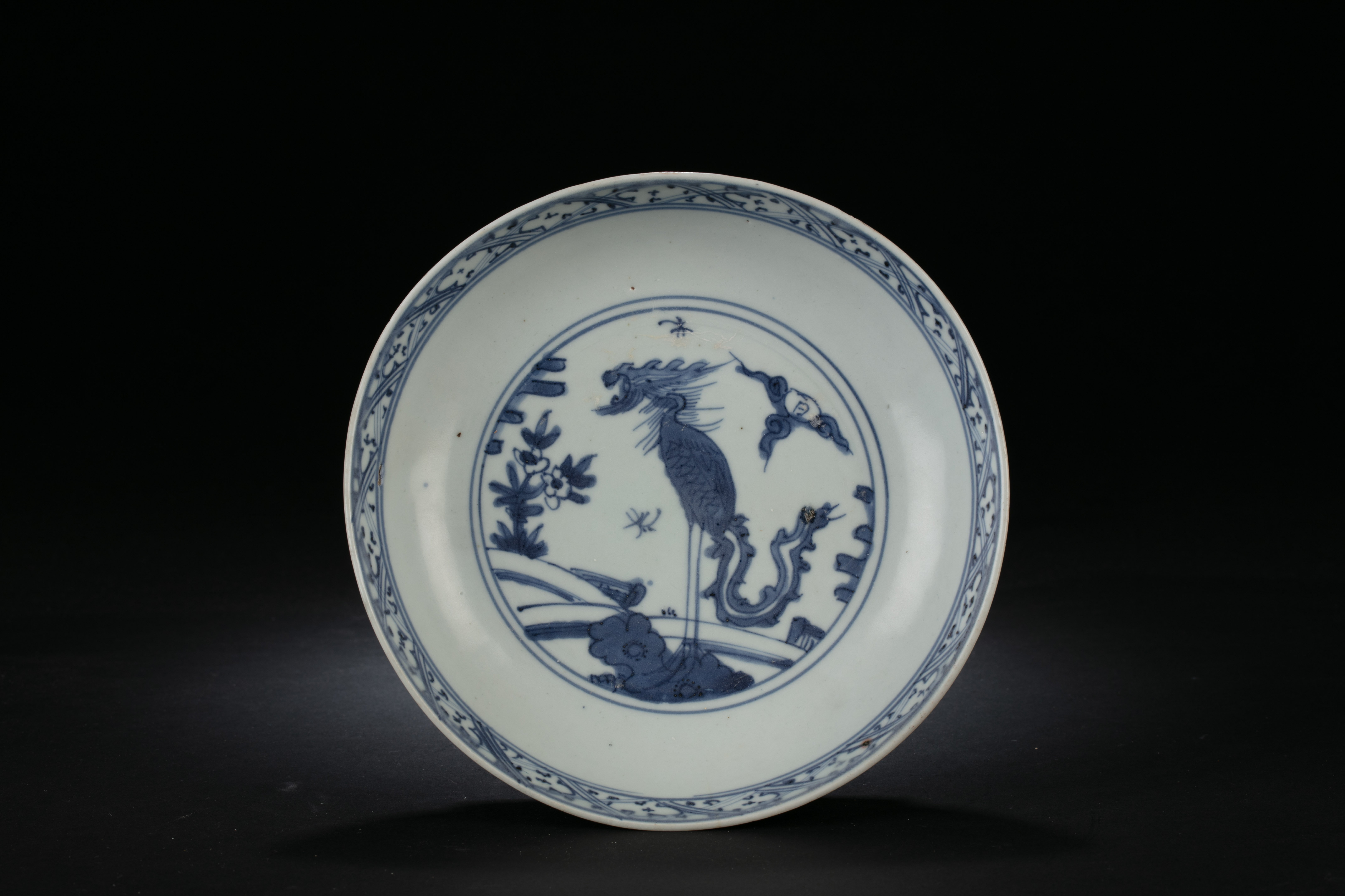 此件明代万历时期青花丹凤朝阳图'余造佳器'款瓷盘,高4厘米、口径19厘米、底径11.2厘米。器型规整,胎质洁白坚致,釉面青白泛青,青花呈色泛灰,浓重处泛黑,体现了万历时期景德镇民窑青花瓷的典型特征。盘心绘有丹凤朝阳图,凤凰面对太阳作欢鸣腾飞状,象征美好光明,寓意高位吉运。'凤鸣朝阳'在古代文化中比喻天下贤才人尽其用,君臣有秩,天下吉祥。'余造佳器'款识为民窑常见标记,反映了当时民窑瓷器的商品属性和质量意识。此盘不仅展示了明代民窑工匠精湛的制瓷和绘画技艺,也是研究明代中后期吉祥纹样文化和海上贸易历史的重要实物资料。
