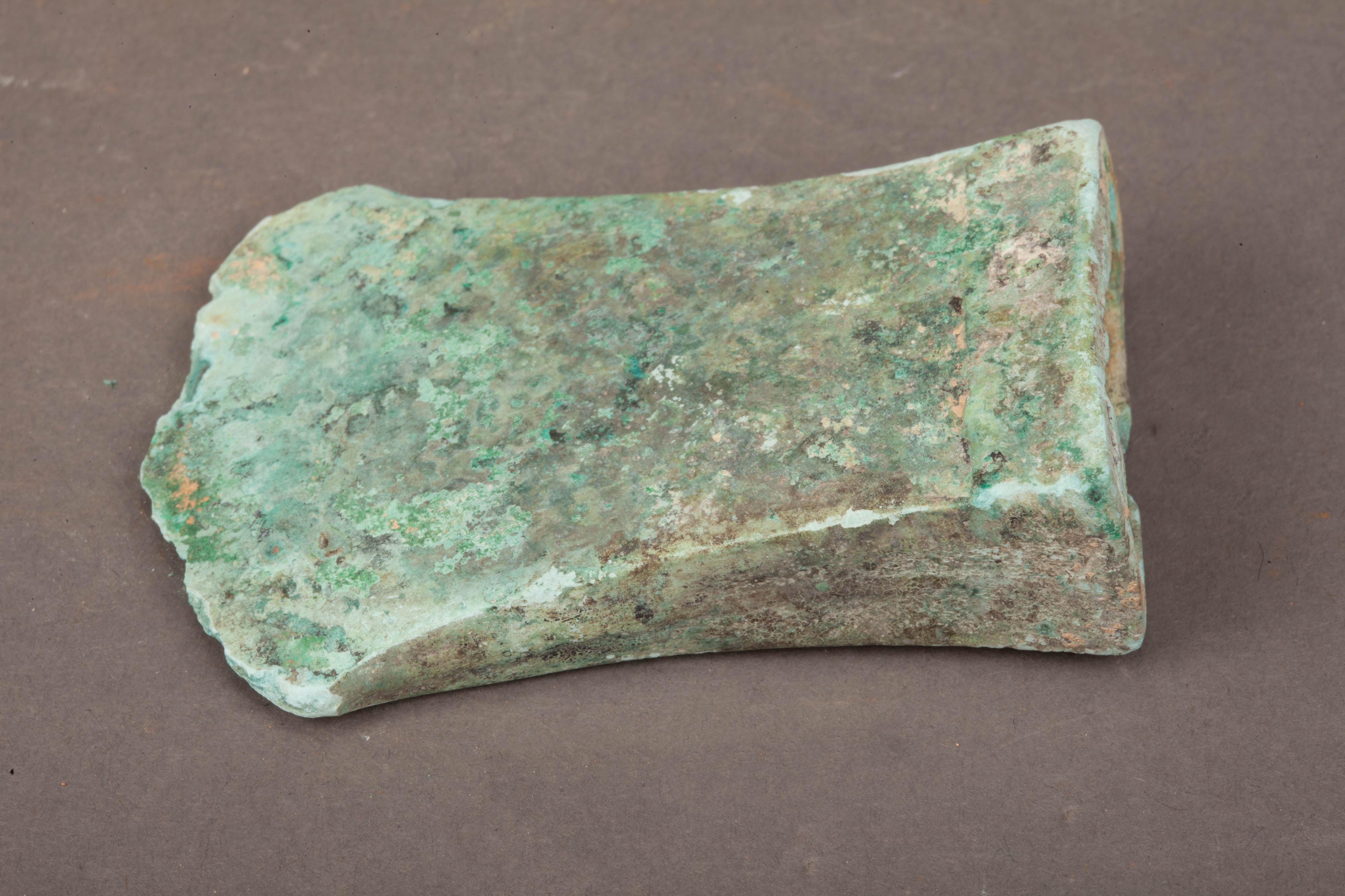西周中晚期青铜斧是商周时期常见的青铜工具和兵器,在当时的社会生活中占有重要地位。青铜斧通常通长7-8厘米,銎口长4-5厘米,刃宽6-7厘米,双刃较锋,刃两侧略向外撇呈弧形。西周青铜斧的用途主要有两种观点:一是作为继新石器时代石斧之后出现的砍木或砍凿坚硬物质的生活生产工具;二是认为青铜斧在社会发展中逐渐成为货币,特别铸有简单的图纹和数字,失去手工工具的使用价值。青铜斧的造型精美,表面细腻并呈现绿铜锈,保存较好。广东省博物馆收藏的西周中晚期青铜斧经专家鉴定为国家三级文物,是研究西周时期青铜工艺和社会经济的重要实物资料,反映了当时青铜铸造技术的高超水平和岭南地区与中原文化的交流。