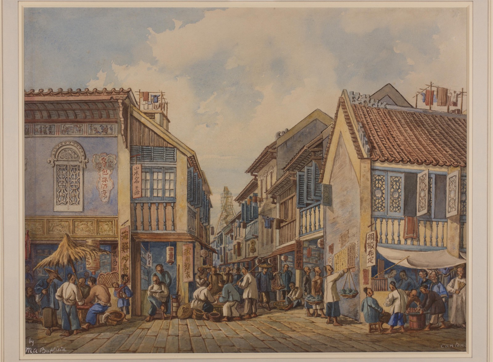 作品由意大利艺术家安东尼奥·巴普斯塔(Antonio Bapista)创作,通过西方艺术家的视角展现了19世纪广州的城市景观和社会生活。画面以写实的风格描绘了广州的街道布局、建筑特色、市井活动以及人文风情,为我们提供了一个独特的观察视角。