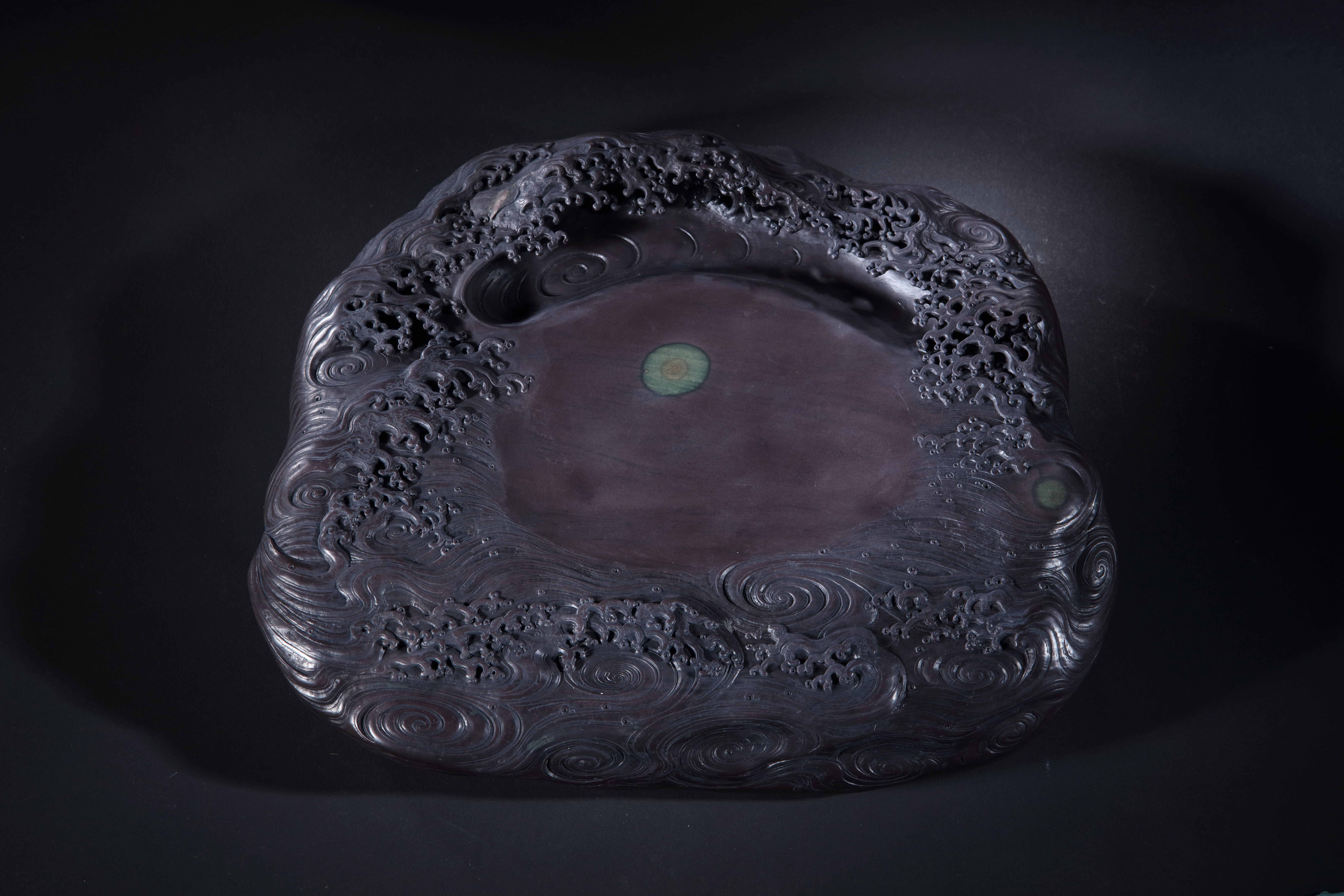 这件2012年程振良制顺流逆流端砚,尺寸为长32厘米、宽27.5厘米、厚6厘米,是程氏第十四代制砚传人程振良的精心之作。程振良作为中国文房四宝制砚艺术大师,师承国家级非物质文化遗产端砚制作技艺项目传承人程文,其作品以传统技艺为主导,不断融入新风格、新题材。这件端砚以"顺流逆流"为主题,寓意人生如流水,既有顺境也有逆境,体现了中国传统哲学思想。端砚制作技艺作为国家级非物质文化遗产,制作过程复杂,包括采石、选料制璞、设计、雕刻、配盒、打磨、上蜡等流程。程振良的作品注重因材施艺、以形配图,这件端砚在继承传统工艺的基础上,融入了现代审美理念,展现了端砚艺术的创新与发展。