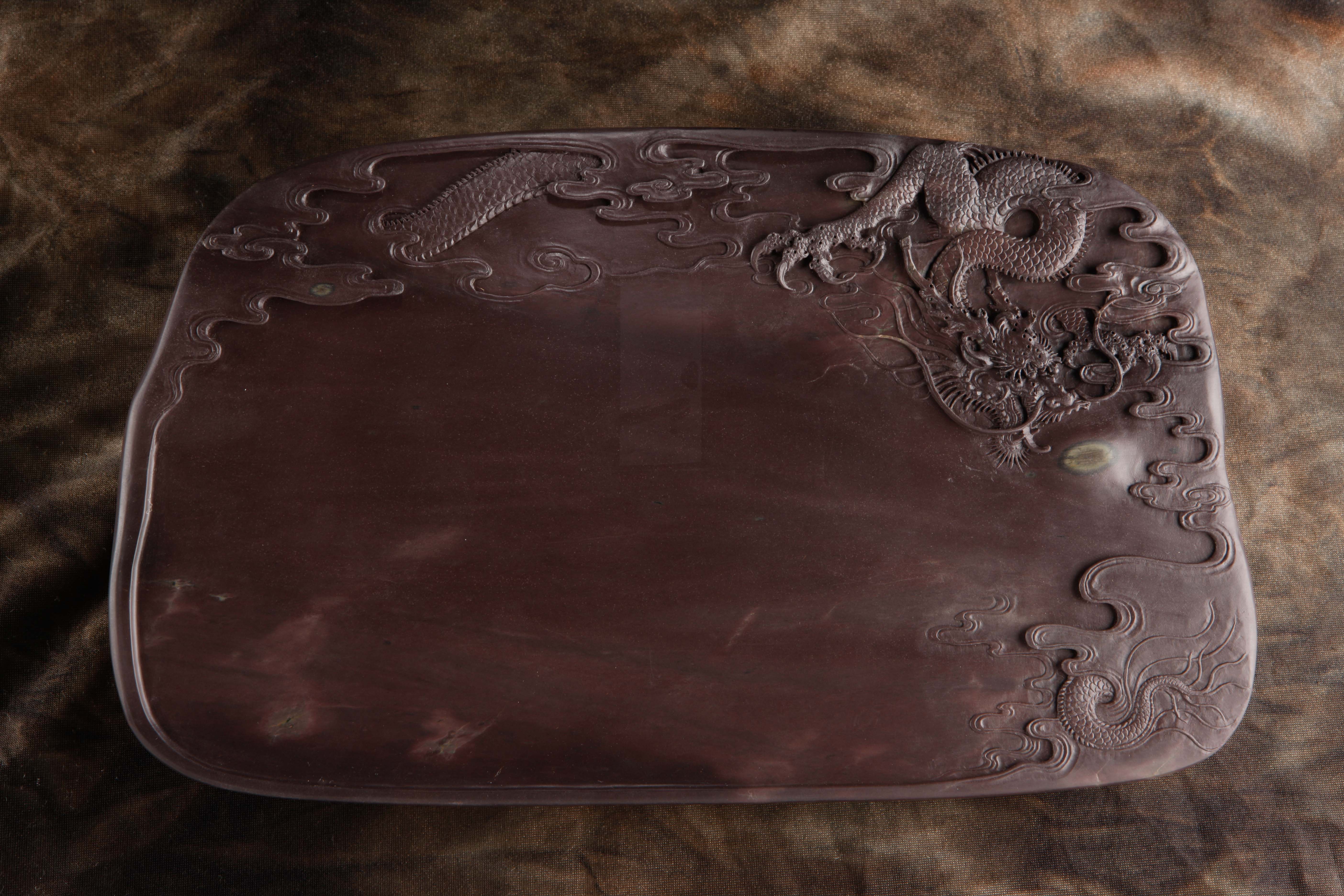 这件当代蔡三洪制端石云龙随形砚,长33.5厘米、宽20厘米、厚4厘米,是2012年创作的精品。蔡三洪大师是二十世纪六十年代初出生于广东省肇庆市端州区黄岗白石村蔡氏制砚世家,为蔡氏"蔡家龙"砚雕第二十三代传人。作为中国文房四宝制砚艺术大师、高级工艺美术师、肇庆市第三批市级非物质文化遗产项目代表性传承人,蔡三洪以雕刻"蔡家龙"家族绝技著称,刀法娴熟,线条流畅。作品构图形象灵动,云龙婉转盘旋,霸气隐现。蔡三洪创作讲究自然、质朴、纯净,十分注重利用砚石的天然纹理进行设计,擅长以深浅浮雕的技法制砚。其家族制砚始于宋代,世代以制砚为生,至清代即成为肇庆颇有影响力的制砚家族。在近代,其父亲蔡泉安有幸受到周恩来总理的盛情邀请,前往北京参加天安门城楼的修建华表雕刻工作。蔡三洪主张"天然去雕饰,清水出芙蓉"的设计理念,更多地保留端砚的实用性价值。这件云龙随形砚体现了蔡三洪将王者风范、威严与民间人文色彩的龙糅合于刀笔之下,开创龙砚的新思维、新形象,既承继家族传统技艺的精髓,又贯通传统文化中龙为尊贵与神圣的灵魂,赋予作品吉祥的文化内涵与现代审美意味。