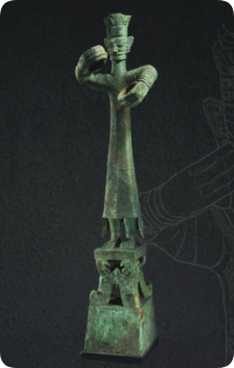 人像站立在一个由怪兽承托的平台上,平台四周雕刻着云气纹、连珠纹和太阳纹,呈现太阳从天边升起的景象。整个造型给人以冉冉上升的动感,似乎表达了古蜀人通过这位"王者"接近神灵的愿望。