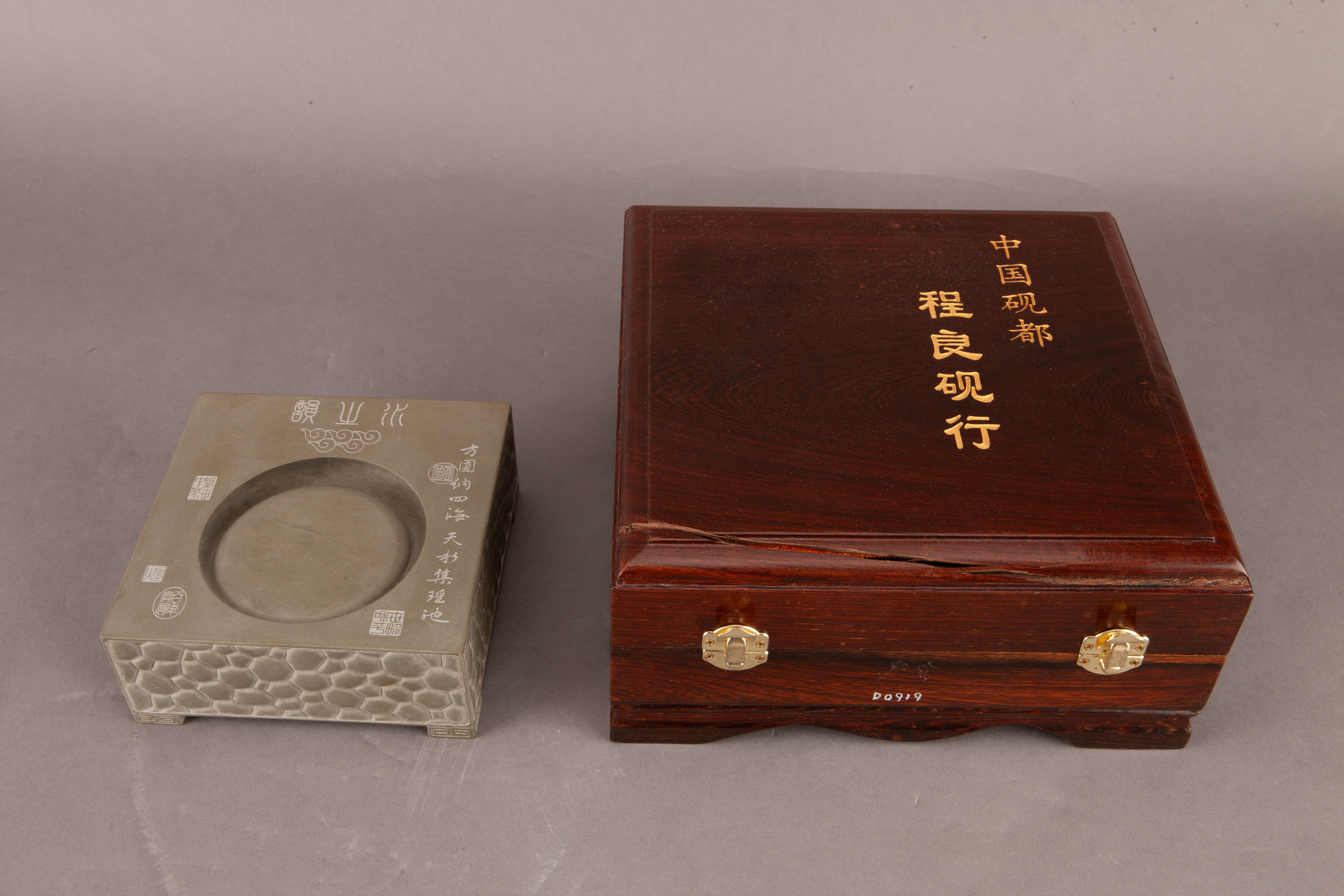 此件当代绿端'水之韵'砚,尺寸为长15厘米、宽15厘米、高6厘米,由优质绿端石材精心雕琢而成。绿端是端砚中的名贵品种,以其独特的绿色调而闻名,这种绿色源于砚石中的铁质成分,给人以清新、宁静之感。端砚作为中国'四大名砚'之首,有着'群砚之首'的美誉,石质致密坚实幼嫩、细腻,温润如玉,按之如小儿肌肤,摩之寂寂无声响。此砚以'水之韵'为主题,巧妙融合了水的灵动与端砚的沉稳,雕刻技艺精湛,刀法流畅自然。端砚不仅具有实用价值,更蕴含着丰富的文化内涵,象征着文人的品德和才华。此件作品通过端砚这一传统载体,展现了对水文化的理解与诠释,水的包容、灵动与坚韧,正是中华民族精神的重要体现。
