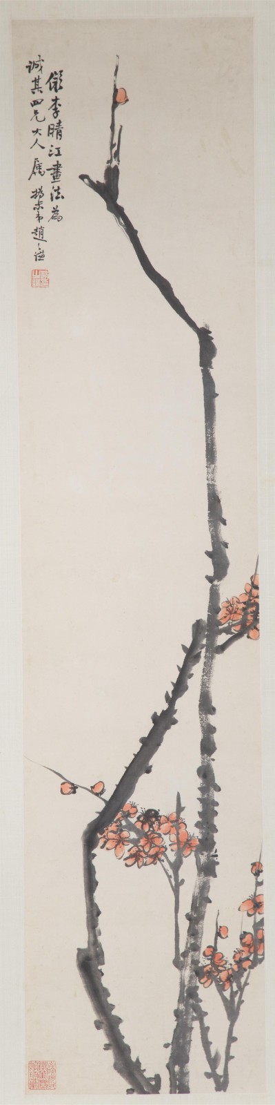 清赵之谦红梅图轴是一件纵138.2厘米、横31厘米的纸本绘画作品,展现了赵之谦在梅花题材上的卓越艺术造诣。赵之谦作为清代晚期著名的书画家、篆刻家,在绘画领域以花卉题材见长,尤其擅长画梅。他将书法、篆刻的笔力与构图理念融入绘画,其梅花作品强调"以书入画",枝干用笔苍劲有力,融合金石韵味,形成独特的"金石画风"。这件红梅图轴体现了赵之谦受徐渭、八大山人等前代写意画家影响,但更注重笔墨的凝重与形式的概括,梅花形态介于写意与写实之间,既具自然生机,又富抽象意趣。在构图上,赵之谦善以疏密对比营造空间感,梅枝布局错落有致,常以斜出、曲折的枝干增强动势,画面充满张力。用墨浓淡相宜,干湿并用,梅干以焦墨枯笔皴擦突出质感,花瓣则以淡墨或浅色点染,柔中带刚,形成鲜明对比。赵之谦部分梅花作品设色明丽,受恽南田没骨法影响,偶用胭脂、白粉点瓣,清雅中见鲜活。梅花在中国传统文化中象征孤高坚韧的文人品格,这件作品通过诗书画印一体的表现形式,充分展现了文人画的特色。赵之谦的梅花艺术对近代海派画家如吴昌硕、齐白石产生了深远影响,其"金石气"与写意结合的画风,成为清末花鸟画转型的重要标志。