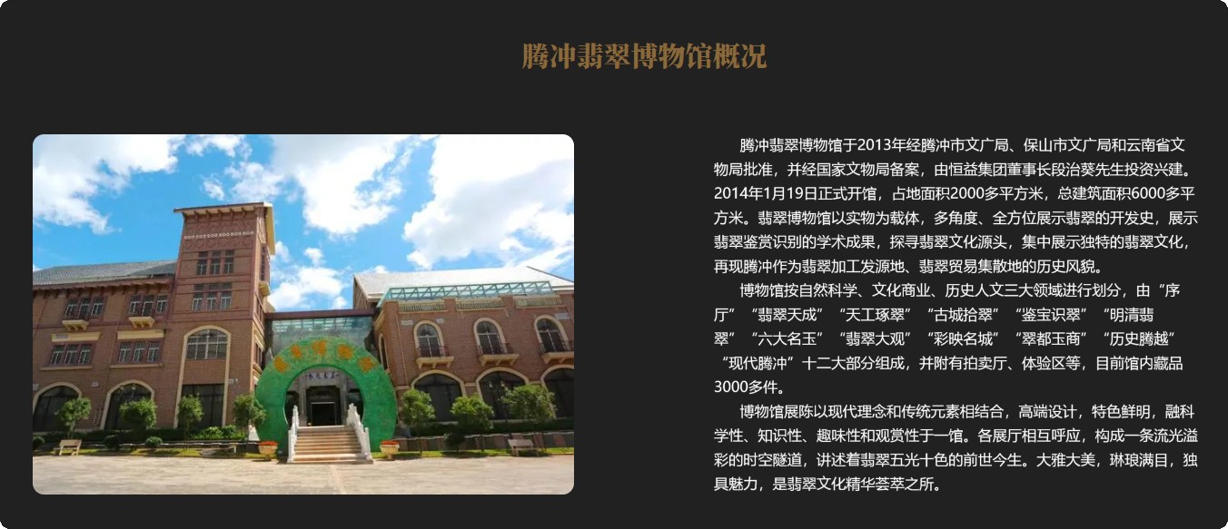翡翠是腾冲特有的一个文化符号,翡翠文化是腾冲最重要的本土文化。翡翠博物馆承载了丰富的文化内涵,是腾冲人文化自信的具体体现。翡翠博物馆以企业为主体兴建,是段治葵先生个人魅力、家国情怀的具体体现。翡翠博物馆通过历史、文化、艺术与经济的综合影响,满足了不同社会群体、不同层次人们的不同需求,积极推动翡翠产业的发展。翡翠博物馆以文化带动经济,二者相互促进,为产业转型、对接资本市场、产融结合提供更多、更大的机遇。翡翠博物馆是恒益集团、翡翠界、各级政府部门强大的对外宣传窗口。